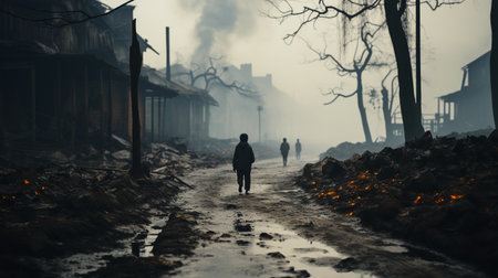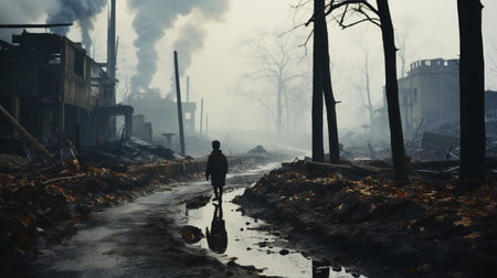 A lone individual traverses a barren and devastated area, enveloped in thick smoke and surrounded by wreckage. The atmosphere is heavy and melancholic, evoking a sense of loss.