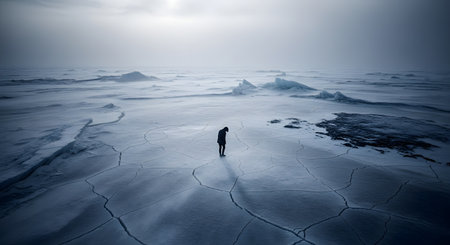 A solitary person stands in the middle of a vast and desolate frozen landscape under a bleak, grey sky. The cracked ice stretches to the horizon, creating a powerful image of solitude, isolation, and human vulnerability against the power of nature.