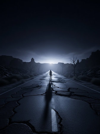 A solitary silhouetted figure walks down a cracked asphalt road in a dark, eerie landscape with distant mountains and sparse trees under moonlight.