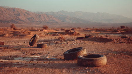 A serene desert landscape featuring abandoned tires scattered across a dry terrain, enhancing the theme of environmental neglect against a mountainous backdrop.