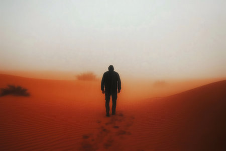 Surreal scene of a lonely man walking in the rain in a red desert, creating a mysterious and evocative atmosphere
