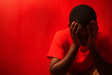 A young Black woman holds her head in her hands, conveying a profound sense of emotion. She is in a minimalistic, well-lit space featuring a striking red background, which enhances the mood.