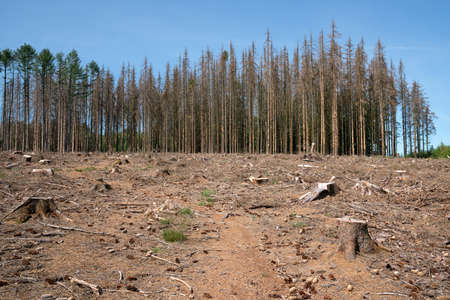 Panoramic image of dead forest, forest dieback in North Rhine Westphalia, Germany