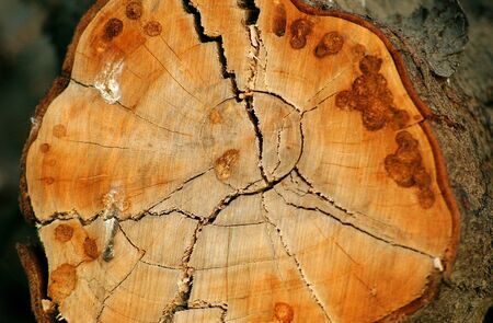 Old grey brown wood cut texture. Grunge dark background closeup. Detailed texture of a cracked section of a tree.
