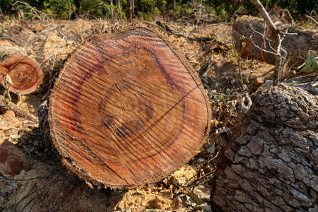 Freshly cut trees in a forest area. Deforestation, industrial logging. Environmental damage. Horizontal photo.