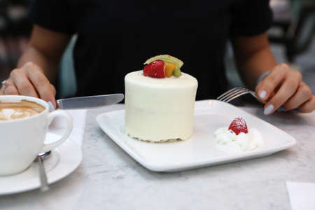 Double tiramisu dessert decorated with fresh berries, female hands with coffee on the background