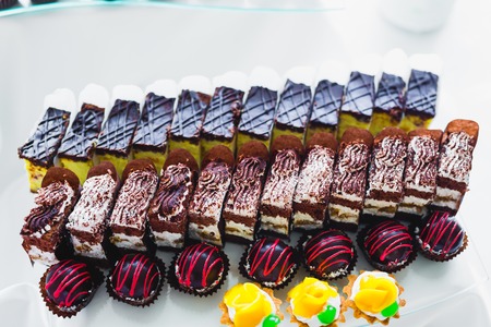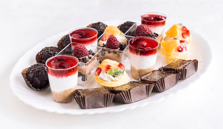 Assorted mini cakes sweet dessert, chocolate and fruit