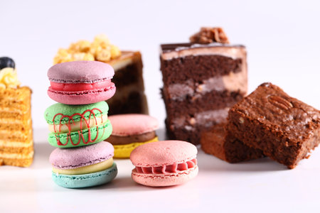 Selection of various cake pieces, macaroons, meringues, cookies and donuts on a wooden desk on a light background. top view. Confectionery background.