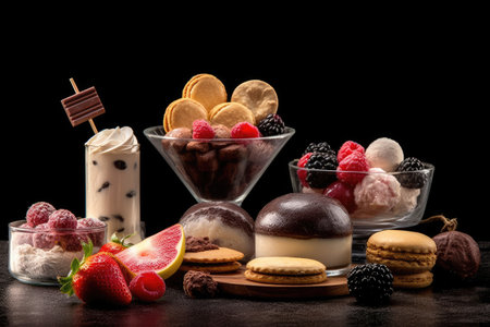 An assortment of delicious desserts with fresh berries, including cakes, macarons, and tartlets, ready to enjoy.