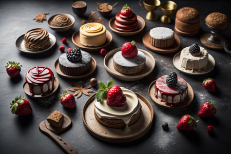 Different desserts on plates. Small cakes and berries. Creme caramel and cheesecake. Feast for sweet tooth.