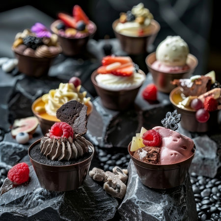 Many cups with different types of desserts based on mousse and panna cotta garnished with chocolate and cream