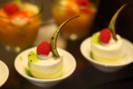 blurry defocused image of chocolate pudding mousse with mix fruit and cream on top for background