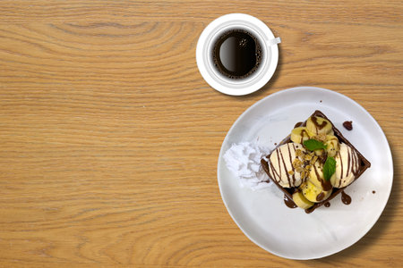 Smooth chocolate cake with milk sauce on top and spoon in white plate on wooden table with copy space - Sweet food, Dessert, Backgrounds and Delicious food concept