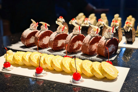 A festive assortment of Swiss roll cakes featuring yellow, reddish-brown, and chocolate varieties, each topped with whipped cream and red cherry accents.