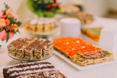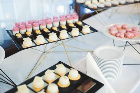 Sweet table at luxury buffet restaurant. Food concept.