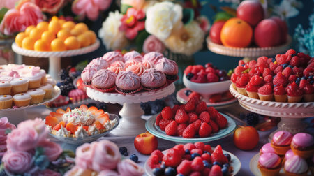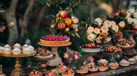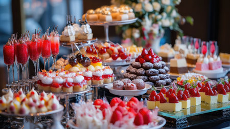 A table covered with an array of gourmet desserts, elegantly presented with artistic decorations