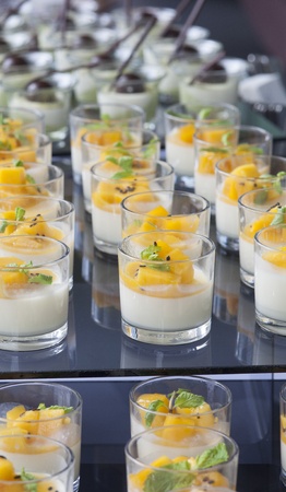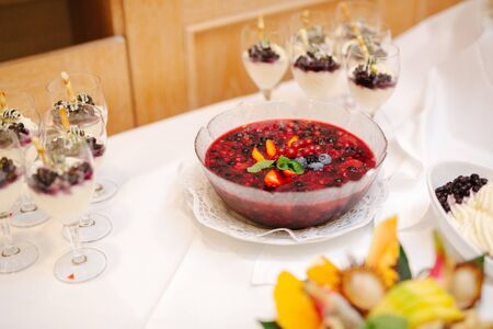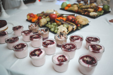 A closeup of yoghurt in small glasses and fruit snacks on the table during an event in a restaurant