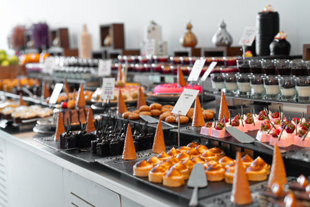 Cocktail party with variety of desserts waiting for restaurants guests, hotel warm light