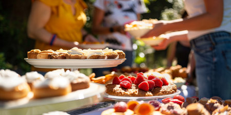 A lively outdoor bake sale featuring plates of muffins, pastries, and tarts topped with fresh raspberries, with people selecting treats in the background