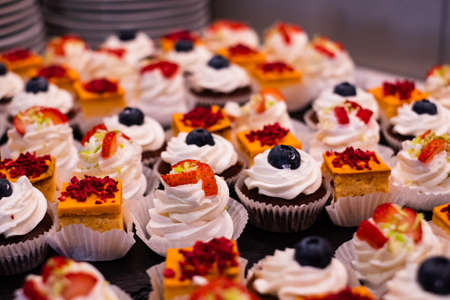 making cupcakes and pastries. Buffet table close-up. Tasty food