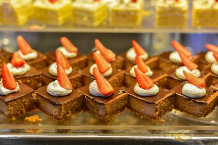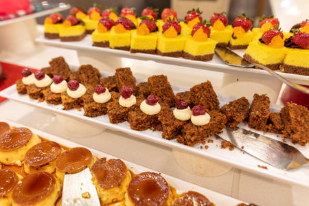 brownie cake with strawberries. Dessert table in a Turkish hotel. Various cakes and sweets on buffet.