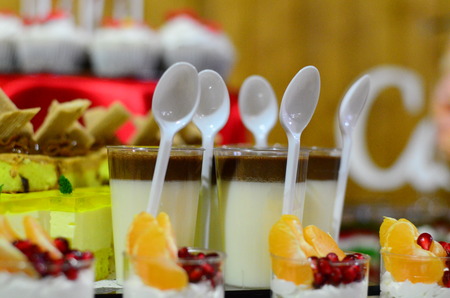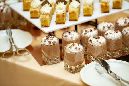 sweet desserts in glassware and other sweets on the buffet table during the coffee break.