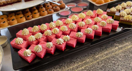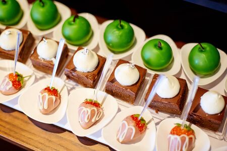 Delicious professional looking food and snacks served at catering event or party buffet style. Mini cake selection. Orange cheese cake. Pavlova with strawberry. Chocolate muffin with mascarpone