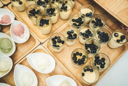 Glasses of vanilla pudding decorated with fresh blueberries and bowls with sweet fruity ice cream on wooden trays. Self-serving buffet table.