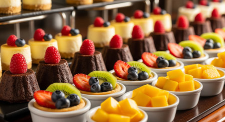 Dessert buffet with mini cheesecakes, chocolate brownies, fruit tarts, and mango cubes arranged in colorful rows