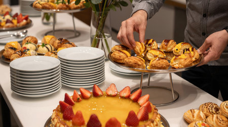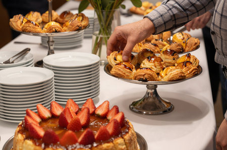 Close up of fresh pastry assortment on table in catering buffet.