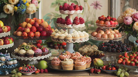 A festive dessert table with a variety of miniature treats, including cupcakes, cookies, and pastries. Generative AI