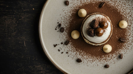A top-down image of a Tiramisu dessert, showcasing its delectable layers of coffee and mascarpone, presented on a beautiful plate that highlights the dessert gourmet appeal.