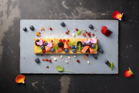 Delicious colorful jelly dessert on black plate. selective focus. 3D Printed Desserts. Smooth Textures and Glossy Finish. Colorful Desserts with Bright Accents. Layered Desserts.