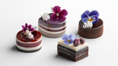 This image showcases a sophisticated assortment of desserts, beautifully layered and adorned with edible flowers, ideal for elegant gatherings and celebrations.