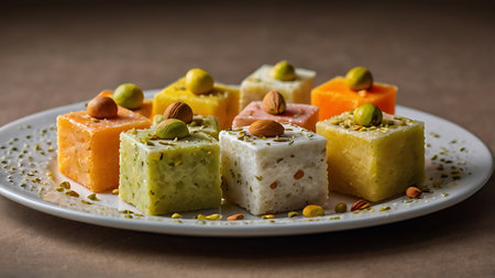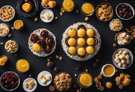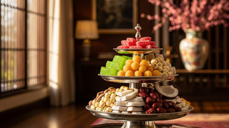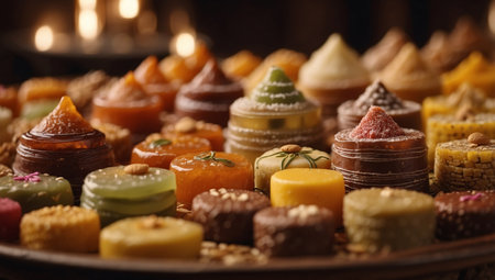 A colorful assortment of regional sweetmeats, each representing a different culture and tradition, displayed on a decorative table.