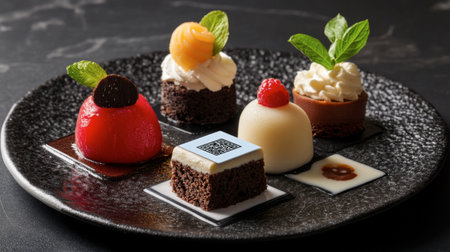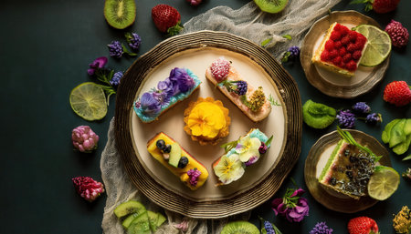 A vibrant display of mini desserts topped with fresh fruits and cream, elegantly presented on a stylish plate, perfect for a culinary showcase.