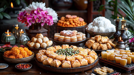A stunning display of colorful traditional sweets and desserts showcases handcrafted treats on a rustic wooden table, inviting indulgence and delight.