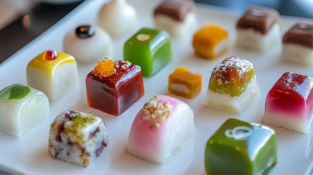 A vibrant assortment of decorative sweets displayed on a plate, showcasing various colors and textures, perfect for festive occasions and culinary enjoyment.