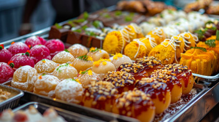 An inviting display featuring a variety of exquisite Asian desserts and snacks, showcasing vibrant colors and enticing textures, perfect for food lovers.