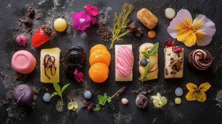 An exquisite selection of gourmet chocolate delicacies beautifully arranged on a black surface, showcasing vibrant colors, unique flavors, and edible garnishes.