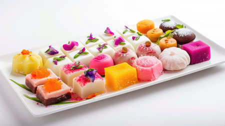 A beautiful assortment of traditional Asian desserts arranged on a decorative plate, adorned with vibrant edible flowers and green leaves, showcasing culinary artistry.