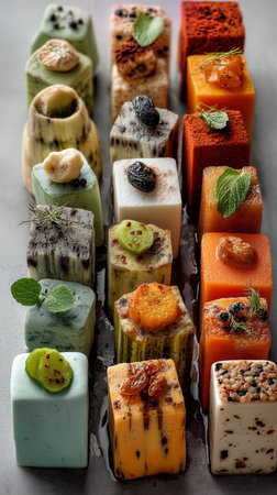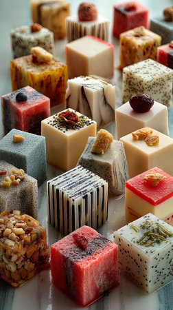 A beautifully arranged selection of artistic miniature desserts, showcasing vibrant colors, intricate designs, and delectable flavors, ideal for parties, celebrations, and culinary events.