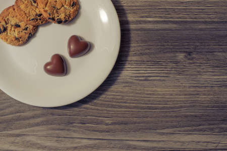 Valentine day holiday event birthday fast food snack child sugar addiction fast food concept. Top up overhead close up closeup photo of tasty mouth watering sweet candies in shape on heart chocolate cookies on kitchen table isolated on gray background copy-space