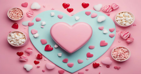 A charming heart-shaped cake sits elegantly on a white plate, adorned with a dusting of powdered sugar and a single red heart on top. The cake is surrounded by scattered heart-shaped candies, creating a festive and romantic atmosphere. The soft pink background enhances the Valentine's Day theme, making it a perfect treat for a special occasion.