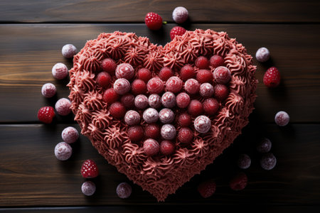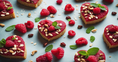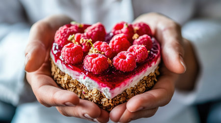 A heart-shaped dessert made with a granola base and topped with fresh raspberries. This visually stunning treat showcases vibrant colors and textures, perfect for gourmet food lovers.