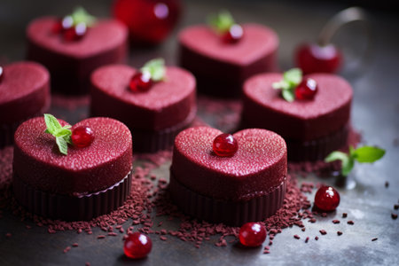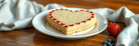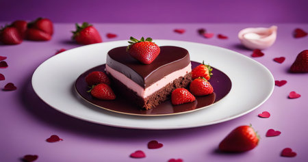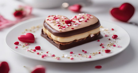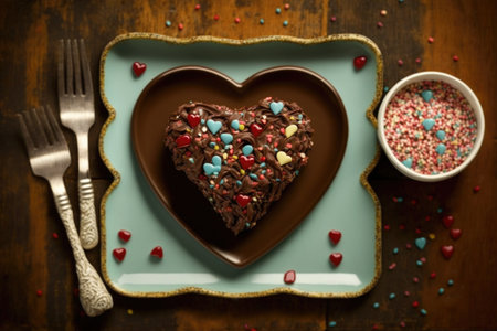 heart-shaped brownie on a plate, surrounded by heart-shaped sprinkles and cherry, created with generative ai