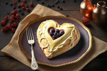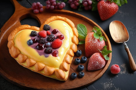 heart-shaped danish pastry with creamy custard filling and fresh fruit topping, created with generative ai