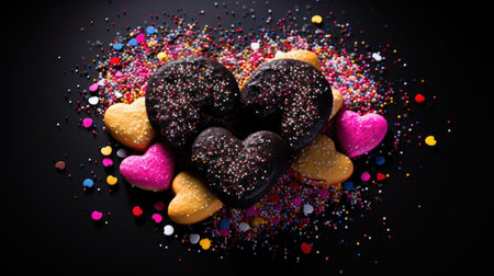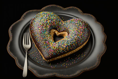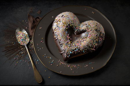 heart-shaped donut with chocolate icing and sprinkles on black plate, created with generative ai