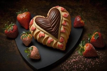 heart-shaped croissant filled with chocolate or almond paste, surrounded by heart-shaped and pastel strawberries, created with generative ai