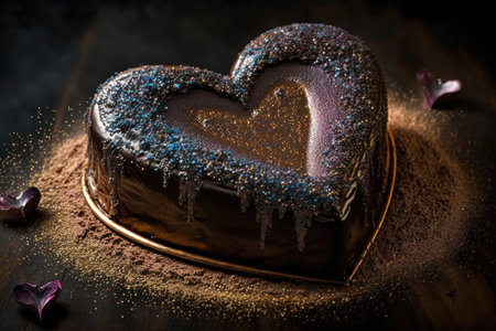 heart-shaped chocolate cake with a flurry of edible glitter shining on the glaze, created with generative ai